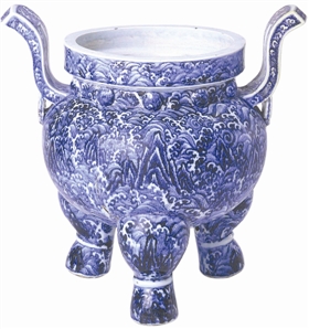 历史发展到大明王朝,经典的永宣海水山石纹可谓独树一帜,它不仅作为主题纹饰出现,还大量运用于边饰和辅助纹饰,成为这一时期极具时代特征的纹 样;这尊明永乐青花海水山石纹鼎式香炉(图2)现藏北京故宫博物院,它不仅彰显着永乐朝强盛的国力,也充分展示了官窑高超的制瓷技艺。浑厚庄重的铜鼎样式 器型彰显着气势雄伟,外壁以钴料苏麻离青绘深邃浩瀚的海水山石纹:象征大江大河的海水纹呈汹涌澎湃之势,留白的浪花如佛手飞溅,在波涛中耸立着形似姜之芽 的山石,两者组合强调“江山”之意、寓皇权“江山永固”、称“海水江崖”。此纹样影响着同期及后世海水和山石纹的发展。