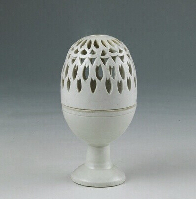镂空法亦称为透雕,是用尖利的工具在坯体未干时对坯体上已设计好的纹样部分透雕出纹饰或将纹样外的空地镂通,这种技法一般多用于相对简单的纹饰。介休窑的镂空产品主要有香薰、炉等,一般采用较为简单的菠萝纹、菊花纹等,通体镂空透雕,造型新颖灵动。