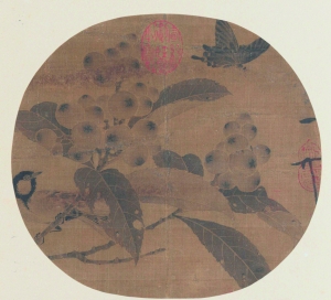宋徽宗赵佶以工细逼真的双钩花鸟画著称。他重视写生,画派结合了多种风格。亦擅书法,自称“瘦金书”。在位时亲自掌管翰林图画院,以广收历代文物、书画扩充藏品。《枇杷山鸟》(团扇,绢本,墨笔,22.7 x 24.7,北京故宫博物院藏。)沿袭了徐崇嗣的“没骨法”(徐崇嗣,南唐画家。徐熙孙。擅画草虫、禽鱼、蔬果、花木等。其画初承家学,因不合当时图画院程序和风尚,遂改学黄筌、黄居寀父子。后又自创新体,所作不用墨笔勾勒,而直接以色彩晕染,世称“没骨图”,也称“没骨花”。),画的左下角画一只玲珑的山雀歇在树上,透过叶间丰美的枇杷,回望轻盈的飞蝶, 墨染的枇杷,情调特别秀润,而墨彩流动、细腻,一种文静的气氛,弥漫在形象的描绘中,通过这种气氛流露的生动性,充满了亲切的、动人的情感。