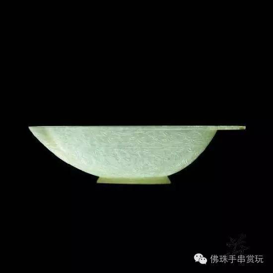 从造型上看,痕都斯坦玉器主要以橄榄式碗和杯子为主要造型。再从它的纹饰上来讲,痕都斯坦玉器多采用植物纹,最明显的特征就是受当地的气候和自然条件,以及风俗习惯的影响,体现在器物上的纹饰多为西番莲图案和绍良花图案。这些也是当地特有的植物品种。