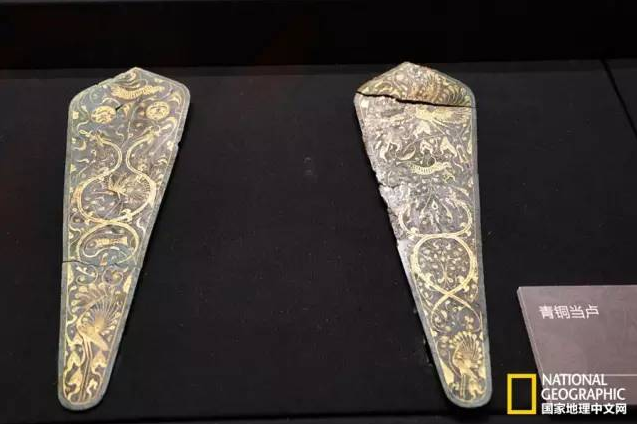 青铜当卢。车马坑出土大型真车5俩,马20匹,每辆车4匹。还有错金银铜制车马器等3000余件,豪华至极。当卢为马匹额头中央偏上部的装饰品,只有高等级人士马匹方能使用,一马一当卢,而墓中出土了当卢三十多件,到底有多少匹马呢?尚需专家进一步考证。