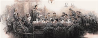 出于内心的虔诚,赵志田对绘画创作始终保有一颗谦逊之心。“艺术创作对一个画家来说,首先是一个学习的过程”,这种学习对他而言不仅是要全方位地了解笔下人和事的精神,更是让自己受教育、受感染,然后再浓缩、加工表现出这种精神。这对一位创作者来说尤为重要也难能可贵。了然于胸成为了赵志田下笔创作前必须要做的功课。自1972年开始,赵志田先后五次深入大庆油田体验真实的工人生活,甚至一呆就是几个月,感受极寒环境带来的挑战,与工人同吃同住,由此诞生了以《大庆工人无冬天》《石油工人一声吼,地球也要抖三抖》为代表的一批表现大庆工业建设的作品。到了20世纪80年代中叶,他决心要做一些力所能及的事,萌生了创作以太行山革命根据地为主题的抗日战争题材画卷,之后曾多次奔赴太行山访问革命老区,一路行走一路采访当年的亲历者或见闻者,尽力使画卷中的人物符合当时的年龄、身份、气质,诞生了《太行情》《烽火太行》等一批作品。即便在今天创作《遵义会议·伟大转折》时,赵志田依然坚持了这多年的习惯,和夫人奔赴遵义会议旧址,尽最大努力搜集图像、考证资料,甚至当年会议时的坐具也都经过了一番考证,因为对赵志田来说“用中国画表现群像本身就不容易,而要表现一个会议且都是真实的历史人物就更加困难”。历史题材需要严肃性,更需要画家对其有正确的认识。赵志田就是这样一个不怕“折腾”的画家。