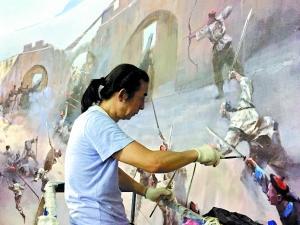 穿过多道“暗门”,记者在一间几乎封闭的、正在交叉施工的展室内,见到了画家许海涛。他正站在一台已升至约4米高的升降机内,右手握着画笔,对 着墙壁上巨型油画中的人物,时而轻点、时而重涂,专心致志进行“雕琢”。画布上的人物,跟随着他画笔的移动,呈现出越发精致的神情。