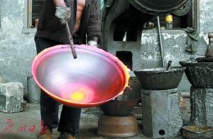 晌午时分,江西省萍乡市东街镇界头村铸锅厂内依然是一派热火朝天的景象:熔铁炉里正喷出熊熊的火焰,十多名工人有的往高温熔铁炉里投放材料;有 的从熔铁炉里取出火红的铁水,然后往铁锅模具里浇灌铁水;有的工人用钢刷将刚刚出炉冷却后的大铁锅进行打磨。今年70岁的汪金元是萍乡市东桥镇出了名的 “铁锅匠”,他祖上世代以铸铁锅为生,这门绝艺至今已传承了600多年。这种铁锅经“祖传秘方”炼制,曾是皇帝的“御用炊具”。但如今,老匠人也面临新问 题,铁锅绝艺也面临失传。为了铁锅手艺不失传,汪金元愿意将铁锅“祖传秘方”传给外人,他也公开向社会“海选”铁锅绝艺的传人。