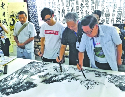 在“艺海流金”内地与港澳文化界交流活动联谊笔会上,老中青艺术家共同完成一幅画作。