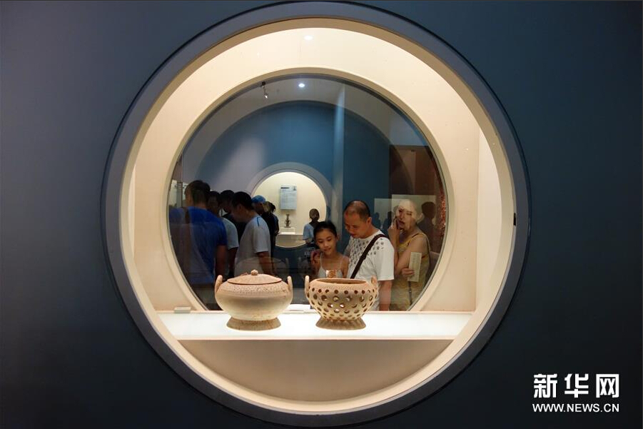 7月31日,一名小学生和家人在湖北省博物馆参观瓷器展。