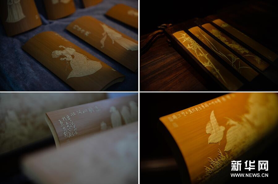(1)这是7月29日拍摄的徐秉方和女儿的部分竹刻作品(拼版照片)。