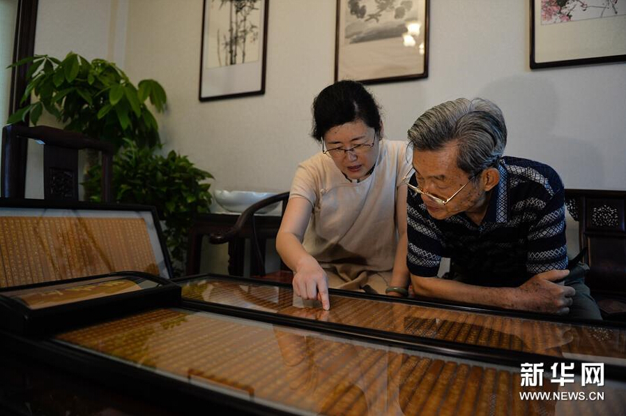 (2)7月29日,徐秉方和大女儿徐文静在家中研讨《道德经》竹刻作品。
