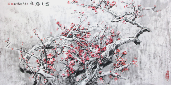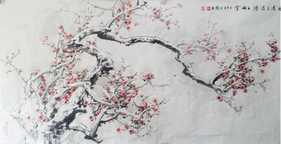 “有梅无雪不精神,有雪无诗俗了人。日暮诗成天又雪,与梅并作十分春。”作品《冰肌玉骨仙姿花》,古干虬枝,苍老浑朴,墨气淋漓,雪压枝头却昴扬向上。梅花竞相吐蕊,争相怒放,千花万蕊于瑞雪中暗香浮动。清风傲骨的梅韵在跌宕雄健的用笔下,尽显凌寒独开的高洁禀性。画作表现出的高洁、坚强、谦虚的梅之精神,给人以立志奋发的激励。作品笔触繁复而独具神韵,野逸枯苍而内韵隽美,放笔恣肆而有神所羁,其艺术感染力,又使观者心旌摇荡,沉醉在诗画的优美意境中。伫立画前,美妙的诗词萦绕于耳:“墙角数枝梅,凌寒独自开。遥知不是雪,为有暗香来。”“吾家洗砚池头树,个个花开淡墨痕。不要人夸颜色好,只流清气满乾坤。”“驿外断桥边,寂寞开无主。已是黄昏独自愁,更著风和雨。 无意苦争春,一任群芳妒。零落成泥碾作尘,只有香如故。”……