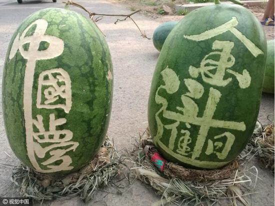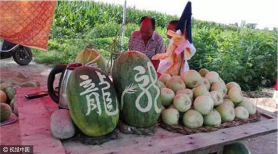 河南平顶山郏县白庙乡黑庙村,56岁的教师谷心亮无意间在自家出售的西瓜上“书写”字画,打开了“西瓜难卖”的市场,11天时间,他家种植的一亩多6000斤早熟西 瓜,在他的“挥毫”下销售一空,连带半亩2000斤甜瓜也快售罄。供图:视觉中国