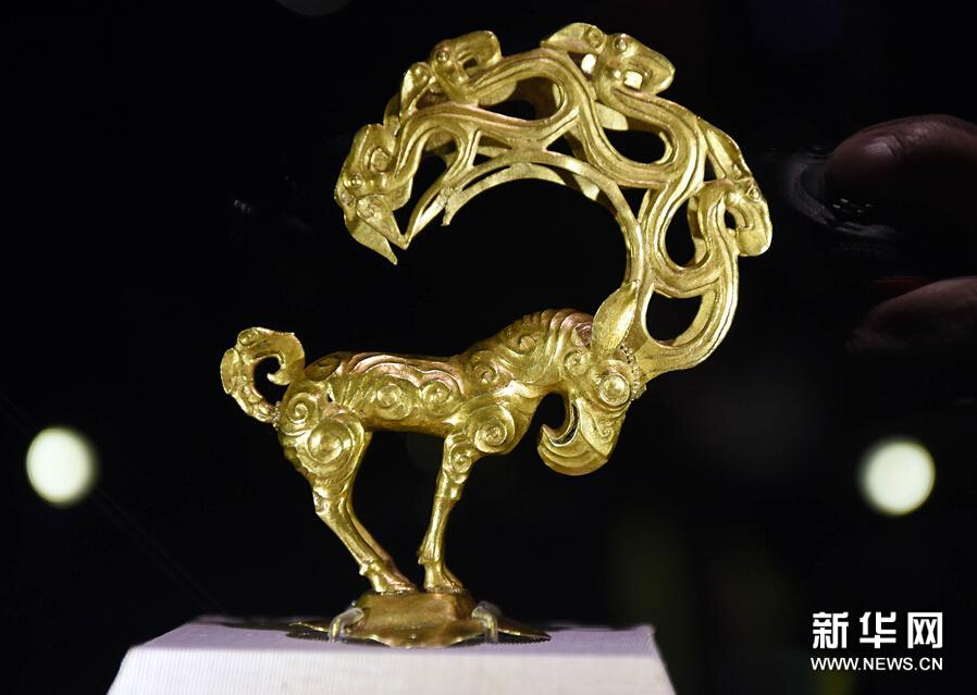在台北故宫博物院展出的陕西省神木县纳林高兔村出土的战国晚期的金怪兽(8月9日摄)。