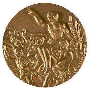 1996年亚特兰大第26届奥运会奖牌正面,奖牌正面是自1928年阿姆斯特丹奥运会以来一直使用的胜利女神奈基的像。奈基的左手托着棕榈叶,右手举过头顶,托着胜利者的月桂花冠。
