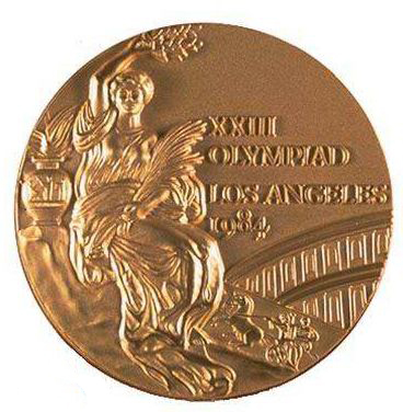1984年中国队首次参加奥运会。本届奥运会奖牌采用佛罗伦萨艺术家朱塞比·卡西奥利为1928年阿姆斯特丹奥运会设计的奖牌原始图样。奖牌正面是古代竞技场和手持月桂花冠的胜利女神奈基。奖牌背面表现手持棕榈叶的一群欢乐的运动员将获胜运动员高高举起的情景,背景是体育场。
