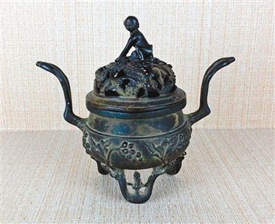 鼠戏葡萄铜熏炉。该熏炉为清末之物,总高17.5厘米,造型和西汉极其流行的博山炉相似,底下有三足支撑,两边有两条外撇的“翅膀”。熏炉的外壁上,有葡萄纹,炉盖上雕有小老鼠和葡萄堆,只见小老鼠鬼鬼祟祟地在葡萄间若隐若现。而盖钮,则做成一只半蹲在葡萄堆上的小猴子。猴子的神情十分警觉,像是在守护着丰收的果实。葡萄堆有丰收之意,猴谐音“侯”,有封侯之意。