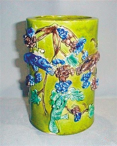 松鼠葡萄瓷雕笔筒。瓷雕是我国的一种独特工艺,是雕刻师巧妙雕工和窑火完美结合的产物。这件清代瓷雕笔筒,高12.8厘米,口径8.2厘米,上面采用高浮雕的形式,雕刻有松鼠葡萄图案。笔筒的背景为浅绿色,葡萄藤为黑灰色,葡萄叶为绿色,密密匝匝的葡萄和聪明伶俐的松鼠或为黑色,或为紫色,设计错落有致,凸凹有形,立体感很强。