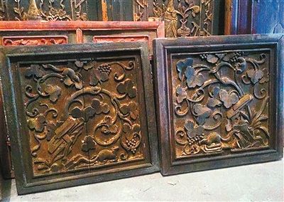 鼠戏葡萄红木花板。在古代,木雕花板由于能在门窗家具上进行广泛应用,又能表达丰富的主题,因此受到欢迎,尤其是在红木家具较为流行的明清,木雕花板更为普遍。这对清代的红木雕花板,各自长64.7厘米,宽53.9厘米,应用在旧式木门上,上面的图案便是鼠戏葡萄。(黑王辉)