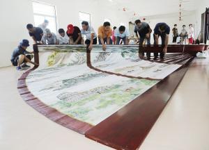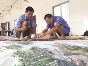 由于扇面巨大,吴金荣和其他几名画画师傅都是蹲在扇面上作画的。“一天都画七八个小时,一只手拿颜料,另一只手画画,两三个小时下来腿都麻了。”吴金荣说,整片沙漠他足足画了一个星期。