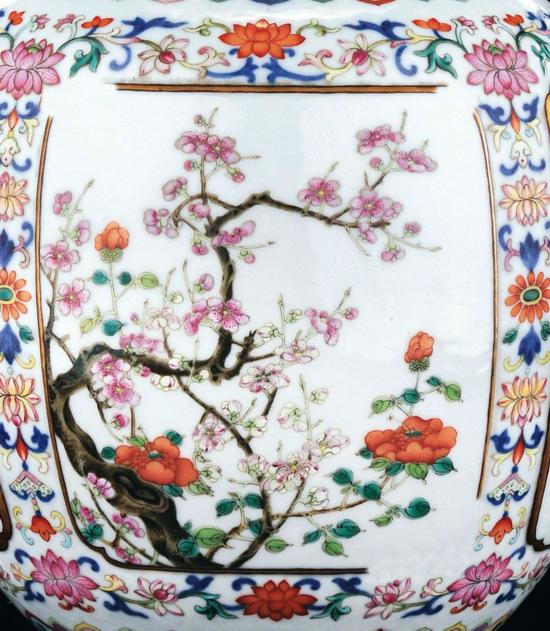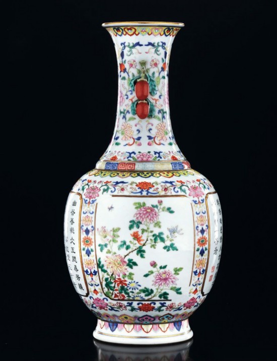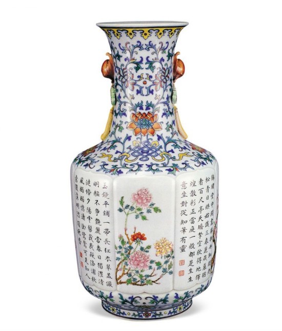 中国嘉德2013春拍中,一件“清乾隆 青花粉彩缠枝花卉开光梅菊图御制诗文柿蒂耳瓶”(lot 3092)以原本估价6倍多的2702.5万元成交,该器亦是乾隆御制诗瓷器的佳器。