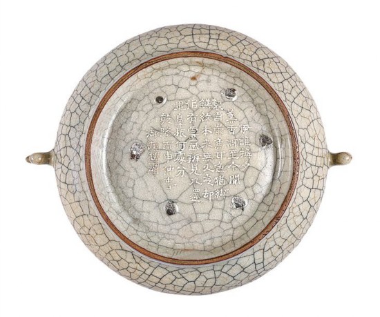 例如,北京故宫博物院珍藏的宋哥窑双耳炉,造型典雅端庄, 釉面开有许多深浅不一的片纹,深者色呈黑色,浅者色呈黄色,俗称“金丝铁线”,这种自然天成的美趣,备受历代文人及鉴赏家推崇。此件哥窑双鱼耳炉在传世哥窑器物中称得上是精典之作,器底有六个圆形支钉痕,及镌刻乾隆御诗《咏哥窑炉》一首:“伊谁换夕薰, 香诗至今闻。制自崇鱼耳, 色犹缬鳝纹。本来无火气, 却似有云氲。辨见八还毕, 鼻根何处分。”寥寥数句,即把哥窑釉色之美展示给世人。