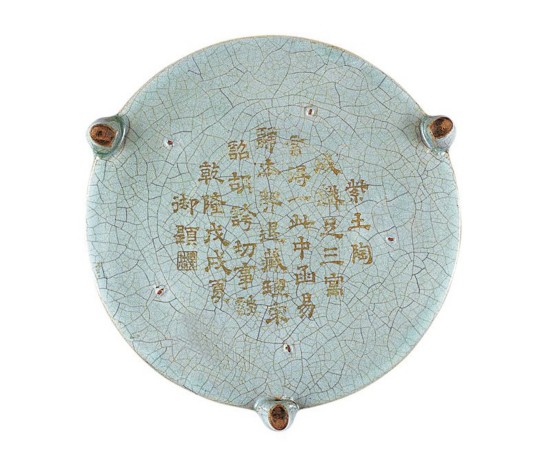 对于宫中所藏汝窑瓷器,乾隆皇帝更是珍爱有加,在传世品的许多件汝窑器物底部都刻有乾隆皇帝的诗文,如北京故宫博物院藏一件汝窑三足圆洗,淡淡的天青釉色细润如堆脂,釉面遍布细碎片纹,韵味无穷。这件三足圆洗极为珍贵,底部镌刻一首乾隆皇帝于戊戌夏时所作的御题:“紫土陶成铁足三,寓言得一此中函。易辞本契退藏理,宋诏胡夸切事谈。”