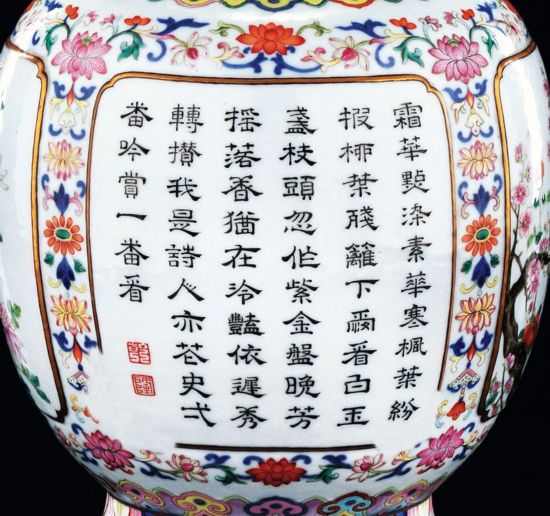 北京故宫收藏有一件粉彩开光花卉御制诗文瓶,腹部呈八莲瓣形开光,四面开光内以粉彩绘牡丹、荷花、芙蓉、梅花四季花卉;另四面开光书楷、行、隶、篆四体乾隆御制诗各一首,其中一首咏牡丹的诗句写到:“锦绣堂中开画屏,牡丹红间老松青。日烘始识三春丽,岁暮犹看百尺亭。夭矫孥空欣得地,辉煊散彩正当庭。一般都是生生意,坐对从知笔有灵。”描绘了一幅美妙的画卷,一诗一画,相得益彰。