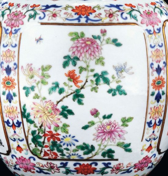 两侧面开光中分别描绘诗中所赞咏的秋菊与冬梅。菊花图以各色不同品种的秋菊为主体,花朵漫生于画面之中,或含苞、或绽放,左上一隅,一只秋虫闻香而至,既巧妙填补了画面空白,又为花朵增添了动感与生气。