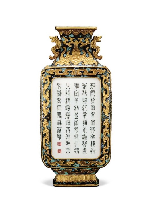中国嘉德2011年春拍中,有一只“清乾隆 仿古铜釉御制诗文轿瓶”上拍,以667万元成交。这只轿瓶隽巧别致,气质华贵,取双夔龙为耳,以仿古铜釉为底色,口沿以下分别装饰如意云头纹和夔蝠纹,瓶腹中间为长形倭角开光,围以模印鎏金夔龙纹,开光内白地墨书篆体《咏挂瓶》诗,篆法古雅清秀。末钤红彩篆书“乾”、“隆”关联章。底部为“乾隆年制”阴文四字篆款,端庄稳健,有别常见的描金篆款,是为乾隆壁瓶少见之款式。底部与背部皆敷设金彩,以模仿铜胎之效果。较之乾隆朝其它壁瓶,本品最为独特之处正是色釉之罕见,为乾隆壁瓶当中仅知的一例。