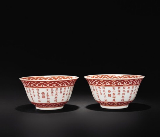 中国嘉德2011年春拍中,有一对“清乾隆 矾红御制诗文茶碗”上拍(lot 3962),以345万元成交。这对茶碗碗口微撇。碗壁以矾红御题诗文一首:“梅花色不妖,佛手香且洁。松实味芳腴,三品殊清绝。烹以折脚铛,沃之承筐雪。火候辩鱼蟹,鼎烟迭生灭。越瓯泼仙乳,毡庐适禅悦。五蕴净大半,可悟不可说。馥馥兜罗递,活活云浆澈。偓佺遗可餐,林逋赏时别。懒举赵州案,颇笑玉川谲。寒宵听行漏,古月看悬玦。软饱趁几余,敲吟兴无竭。”落款:乾隆丙寅小春御题,加盖“乾”朱文圆章,“隆”朱文方章。