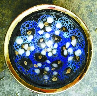 国内藏家收藏的建盏不但有曜变的品种,而且有的还加金,更加珍贵。王声伟收藏的曜变加金盏有各种不同类型,最为典型的是混合型,既有蓝色的网空状窑变,又有白色椭圆点,口沿描金一圈,碗的内外加金点。有的在窑变的基础上随意点金,并杂以红绿彩散点。有的白点与金点交错进行点染,有的则单纯在蓝色窑变上间以金点。多种工艺混合在一起,非常罕见。