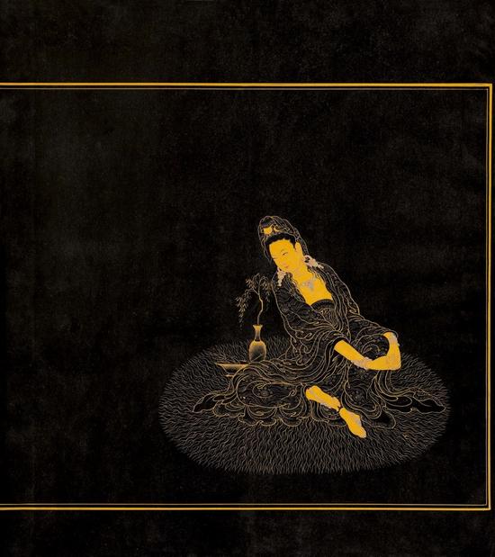 凡用佛青笺、墨笺、洋笺者,因其纸色深暗,故以泥金粉合胶书写。经文内页,则以泥金勾画边框及乌丝阑。前后附页配图亦用泥金勾画。其他各类纸、绢、绫皆以油烟佳墨书写、绘制。