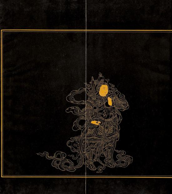 康熙帝创立了清代皇帝书经的一种“官样”楷式。内页经文一般占用四折幅,其后空一页。经文前、后附页由宫廷画师分别以抄经同样的泥金或墨笔绘制大士趺坐像、韦驮立像。画像用白描法,只在佛像的眼睛、嘴唇、璎珞等部位略施色彩,风格细腻精谨。