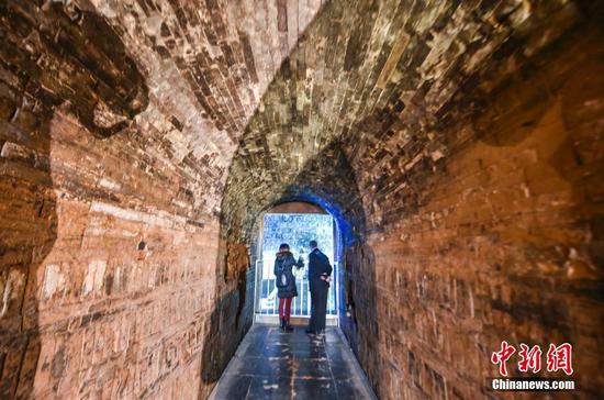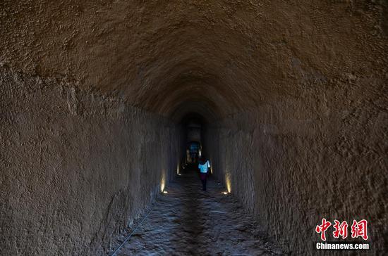该景陵直径110米,现高24米,地宫置于封丘之下,由墓道、前甬道、后甬道和墓室等四部分构成,全长56米余。它于1991年被发掘时采用沿墓道发掘的方式,完整保护了墓室地宫,墓道壁前段为土坯,后段为砖,墓室内石棺所在处为一座大穹顶空间,青砖逐层砌筑。图为12月4日,河南洛阳,北魏宣武帝“景陵”地宫墓道,阴冷恐怖。 中新社发 黄政伟 摄 图片来源:CNSPHOTO