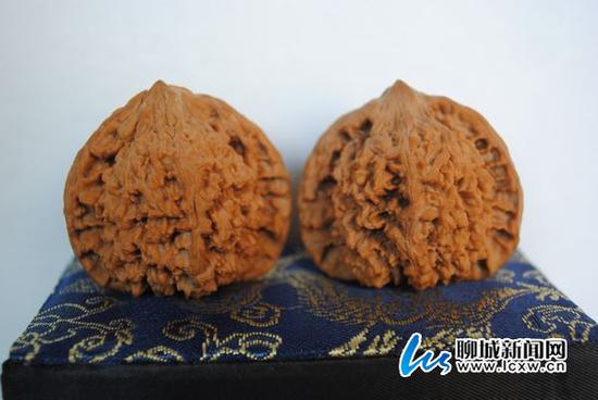 刚刚从树上摘取的核桃,行话叫白茬。两个形状相似、对称度高的,便组成一对。两个白茬相似度越高越值钱。