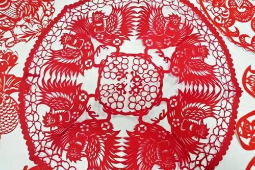 东湖望京西园社区剪纸社庆新年,百鸡寓“百吉”。