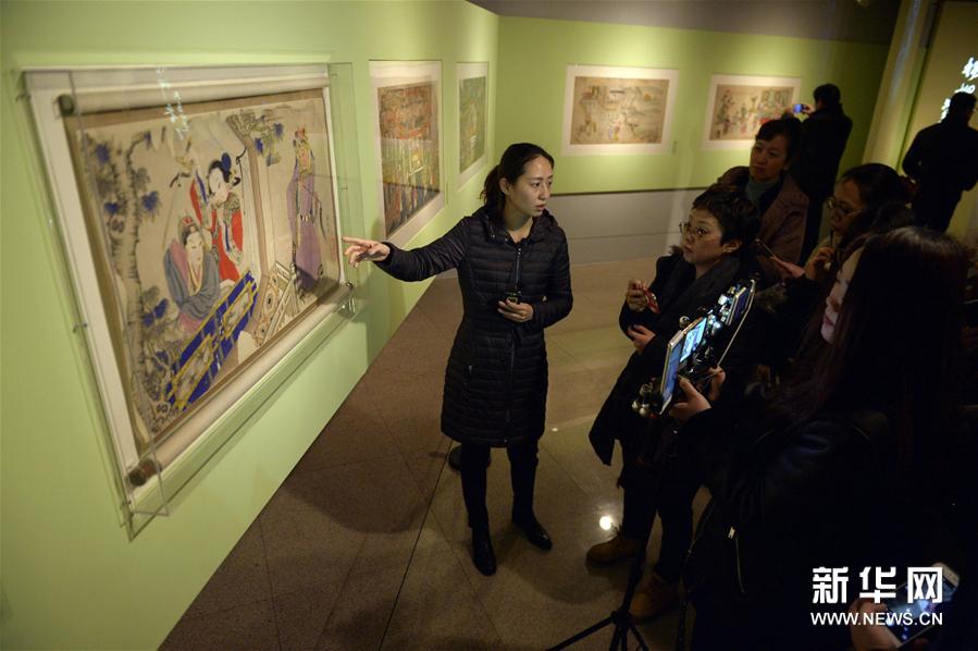 1月23日,北京中国美术馆工作人员(左一)在展览上向媒体记者介绍展出的杨柳青古版年画作品。