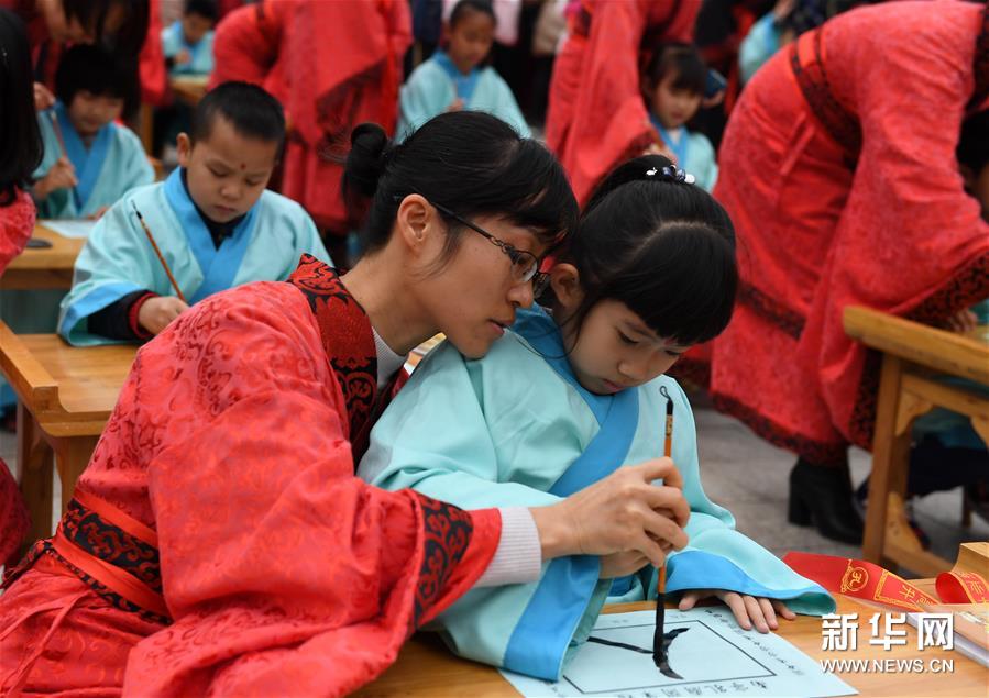 2017年2月11日,广西南宁市孔庙举行新春开笔礼,为50名学童启智破蒙。 新华社记者 周华 摄