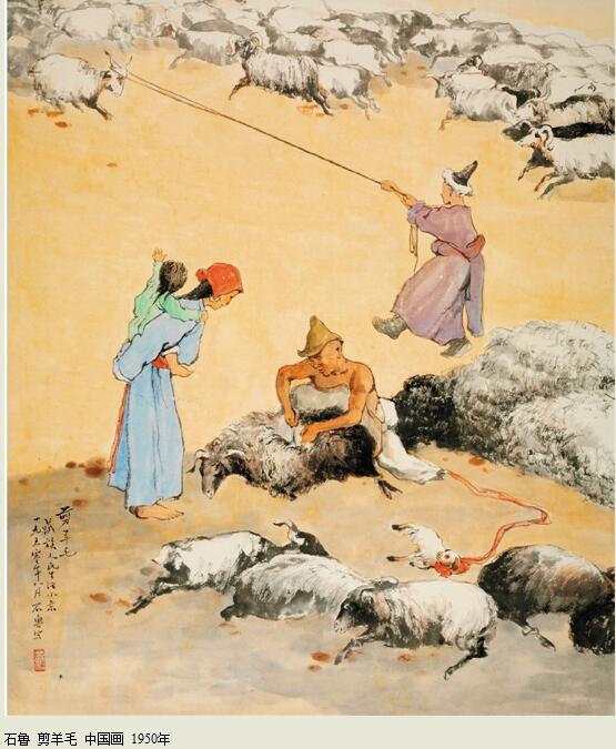 再单独说说综合成就的石鲁在人物画方面的贡献与转变,石鲁作为长安画派的撑旗人他的人物画创作随着思想观念的转变经历了几个不同阶段。早期在延安用现实主义表现手法从事过木刻版画、连环画、素描、宣传画创作,一直到上世纪五十年代初来到西安仍用西方类似油画、水彩绘画手法完成中国画创作《王同志来了》《古长城外》,当然引起争议的是,虽然构思开阔奇特但表现手法缺乏中国特色。后来在1956年毛泽东《同音乐工作者的谈话》中“中国人还是要以自己的东西为主”的思想影响下和他对中国传统绘画思想认识的逐步深入,笔墨开始趋于传统。这时期创作除了印度写生之外就是举世闻名的《转战陕北》,这幅画手法完全采用了中国画笔墨技法表现了现实主义题材,虽然受到具体环境和形象的限制,但构思奇特,意境深远,笔墨与内容结合得比较完美,甚至语言也有新的创造。再后来从六十年代的小景写生作品中看出对自然、物理、中国画史画论和自我的认识越加清晰,并产生《学画录》中一系列个人独特的、高标的中国画理论建树“以神造型”论等,明显直接影响到他的人物画创作。这时期除了完成把中国画笔墨语言的表现与现实的重大历史题材相结合并具有极强表现性的巨作《东渡》之外几乎再没有创作什么现实人物画力作,有部分人物写生作品也在寻求气韵生动、逸笔草草、笔减神全的这种格致,而大部分精力投放在山水画创作中。到七十年代更是彰显个性自由和中国画笔墨精神,以神造型,以心写形,抒写胸中逸气,主要创作文人式山水和花鸟画,极少再有人物画创作。