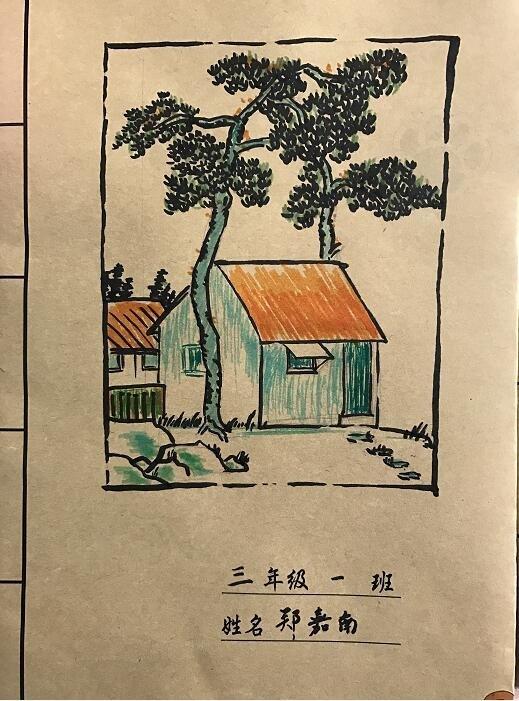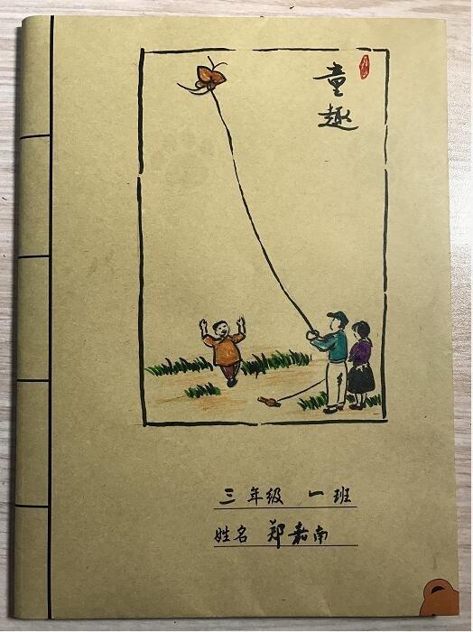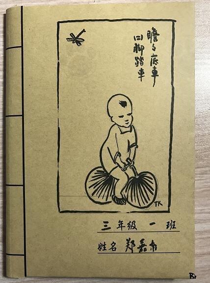 最关键的是,这些书皮用的是最普通牛皮纸,上面那些美轮美奂的图案,全部都是郑爸亲手画上去的,临摹的是丰子恺的漫画作品!
