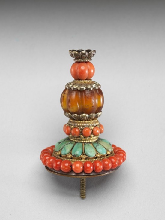 “银嵌珊瑚松石冠顶”冠顶为银质局部镀金,最上方的宝石已失,在绿松石和蜜蜡瓜棱式珠之间,间隔着珊瑚珠。最下层的绿松石作花瓣形饰,外滚一圈珊瑚珠,银胎为锤打成型,打造痕迹依稀可辨,镀金的颜色浅而淡,下器底附一螺纹栓,原应固定在冠帽上,做工朴实,具有西藏地方工艺的特色。