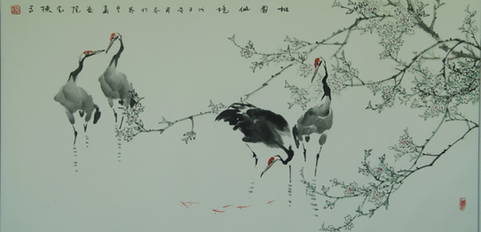 三十多年来执着追求潜心钻研,独辟溪径,形成自我,作品格调清新高雅,灵动柔美,舒朗明快,意境悠远,生活气息浓郁。从他的作品中可以见到深厚的笔墨功力,洗练精髓、娴熟的技巧,寥寥数笔便使几只仙鹤跃然纸上,画家以“拟人化”“生活化”的创作思路,关注生命的感悟与精神追求,画出仙鹤的家庭生活,恋爱、教子等情景。在不失民族精神品格的同时,使笔墨形式更加丰实创新,更具有时代精神。