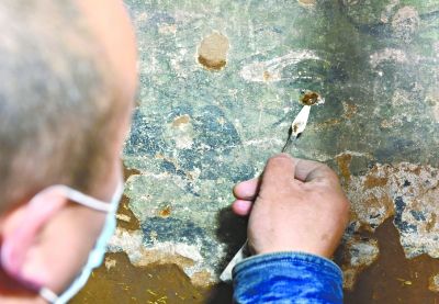 石家庄市西北部的上京村中,始建于唐天宝年间的毗卢寺已矗立千年。斗转星移,这些精美绝伦的壁画在自然、人为等多种因素的影响下,面临着酥碱、起甲、脱落等病害侵扰。日前,敦煌研究院保护研究所的多位专家陆续来到毗卢寺,用约一年时间展开大规模修复工作。图为修复队王兴龙正在修复壁画。