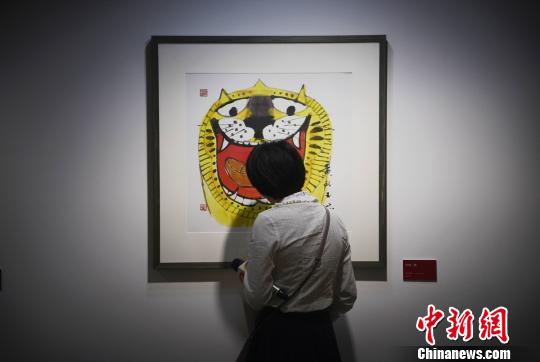 一位记者观看黄永玉的生肖画老虎。 杨华峰 摄