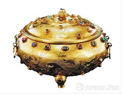 2008年4月11日,在香港苏富比“帝廷金辉——珍贵明清御制金器”专场上,一只明宣德金胎錾“赶珠云龙”纹嵌宝石三足盖炉以约1.17亿港元成交。该器物腹径18.6厘米,炉腹和盖面各錾刻有五爪游龙纹饰,在其金胎上并嵌有红、蓝宝石及珍珠。