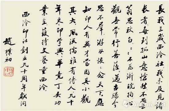 1977年,北京书学研究会成立,赵朴初被推选为会长。1981年,在中国书法家协会第一次代表大会上,赵朴初又当选为书协副主席。1983年,赵朴初当选为西泠印社名誉社长。至1993年,在西泠印社成立90周年庆典大会上,赵朴初被选举为第五任社长。因公务繁忙不能前来,赵朴初特赋诗一首: