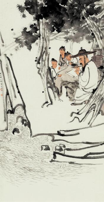 从构图来看,此作非常考究。四个人物与古树奇石,全都集中于画面右上方,真可谓密不透风。寥寥几笔勾出山脚河岸,水纹从上到下由浓转淡,下方大面积留白。整幅画面疏密得当,充分反映了中国画“计白当黑”的魅力。从笔墨来看,与学明先生其他作品一样,以书法入画,线条厚而不涩,落墨凝而不滞,不知是不是因为画高凤翰的缘故,在河岸及树干的勾勒上,总感觉比以往作品增添了些许金石味道。