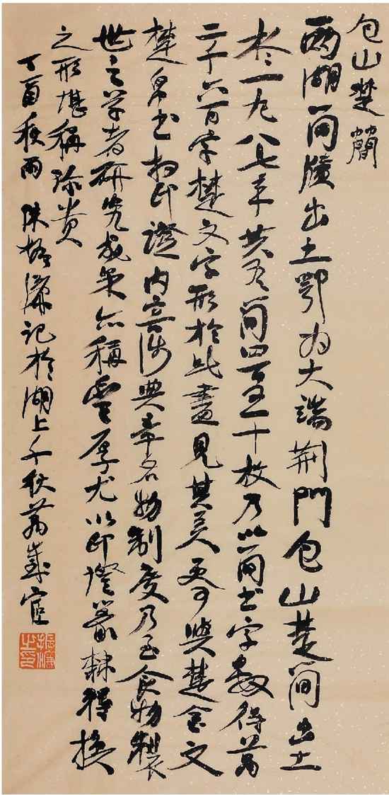 释文:包山楚简。两湖简牍出土,鄂为大端。荆门包山楚简出土于一九八七年,共有简四百五十枚,乃以简书字数得万二千六百字。楚文字形于此,尽见其美;更可与楚金文、楚帛书相印证,内容涉典章名物制度乃至食物制(作),世之学者研究成果亦称丰厚。尤以印证篆隶转换之形,堪称珍贵。