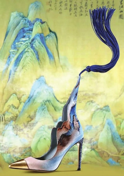 “一寸缂丝一寸金”,缂丝又称刻丝,是中国丝绸艺术品中的精华。它以蚕丝、金线为原料,“通经断纬”的技法容不得丝毫马虎,织就一幅作品,往往需要换数以万计的梭子。缂丝自宋元以来一直是皇家御用织物之一,常用以制作龙袍、复制名贵书画和宫廷装饰品,具有“织中圣品”之美誉。然而,美则美矣,与现实生活却多少有些隔阂。此次展览中,苏州王氏缂丝第六代传人王建江与设计师苗海燕、李丹联手创作的“千里江山翠履霓裳”系列,让人们看到了缂丝全新的表达,成为当代服饰的一部分。这个系列包含女鞋、箱包和礼服,上面的图案取材自北宋画家王希孟的《千里江山图》,但并不大面积使用,而是“采撷”部分加以点缀。如此构思让作品含蓄典雅,既能体现中国传统神韵,又透出时尚感。本届博览会主办方之一、上海公共艺术协同创新中心运营总监章莉莉透露,“千里江山翠履霓裳”系列一经展出,就有很多人询问能不能买。