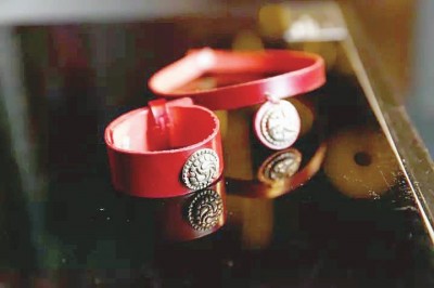 除了磨成墨写字,墨锭还有什么功用?手工艺大师宋连生的答案是:做配饰。只见他把一款朱砂墨锭与中国结编织在一起,再配上几个串珠,一个精美的挂饰就做好了。“以前大家关注墨锭的实用价值,其实很多墨锭上有很好看的图案,稍加修饰,就是很好的装饰品。”宋连生指给记者看一个时尚皮包上的搭扣,“这个也是墨锭,你看上面有很好看的花鸟图案,我从老墨厂收来以后,用金箔给图案中的小鸟上了色,再在墨锭外面框一个木框,是不是与众不同?”宋连生笑容中带着一丝自豪。经他手打造的跨界时尚生活用品还真不少,比如竹艺与银器“混搭”的手镯,结合皮雕技艺与留青竹刻技艺的箱包,木板年画也不印在纸上,而是印在T恤衫上……