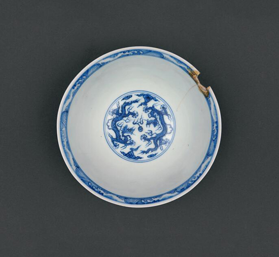 碗敞口、深弧壁、塌底、圈足。内、外青花装饰。内底绘双龙戏珠纹,内壁近口沿处绘海水纹边饰。外壁绘云龙纹两条,近足处绘变形莲瓣纹。外底署青花楷体“大明弘治年制”六字双行外围双圈款。此碗白釉泛青,青花发色柔和淡雅,所绘双龙奔腾于云朵之间,矫健威猛,堪称弘治御窑青花瓷器的典型之作。