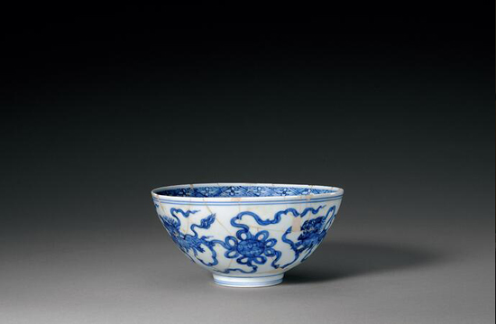 青花内缠枝莲托梵文外龙穿花纹碗 明弘治 (高6.9厘米 口径14.9厘米 足径5.6厘米)